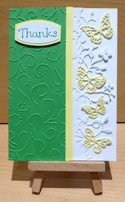 I used a Memory Box 'Grand Thank You' die with patterned paper from an old Dovecraft paper pad. The top part of the card is embossed with a Spellbinders 'Dainty Dots' embossing folder. I added a punched flower in the colours of the flowers on the patterned paper.